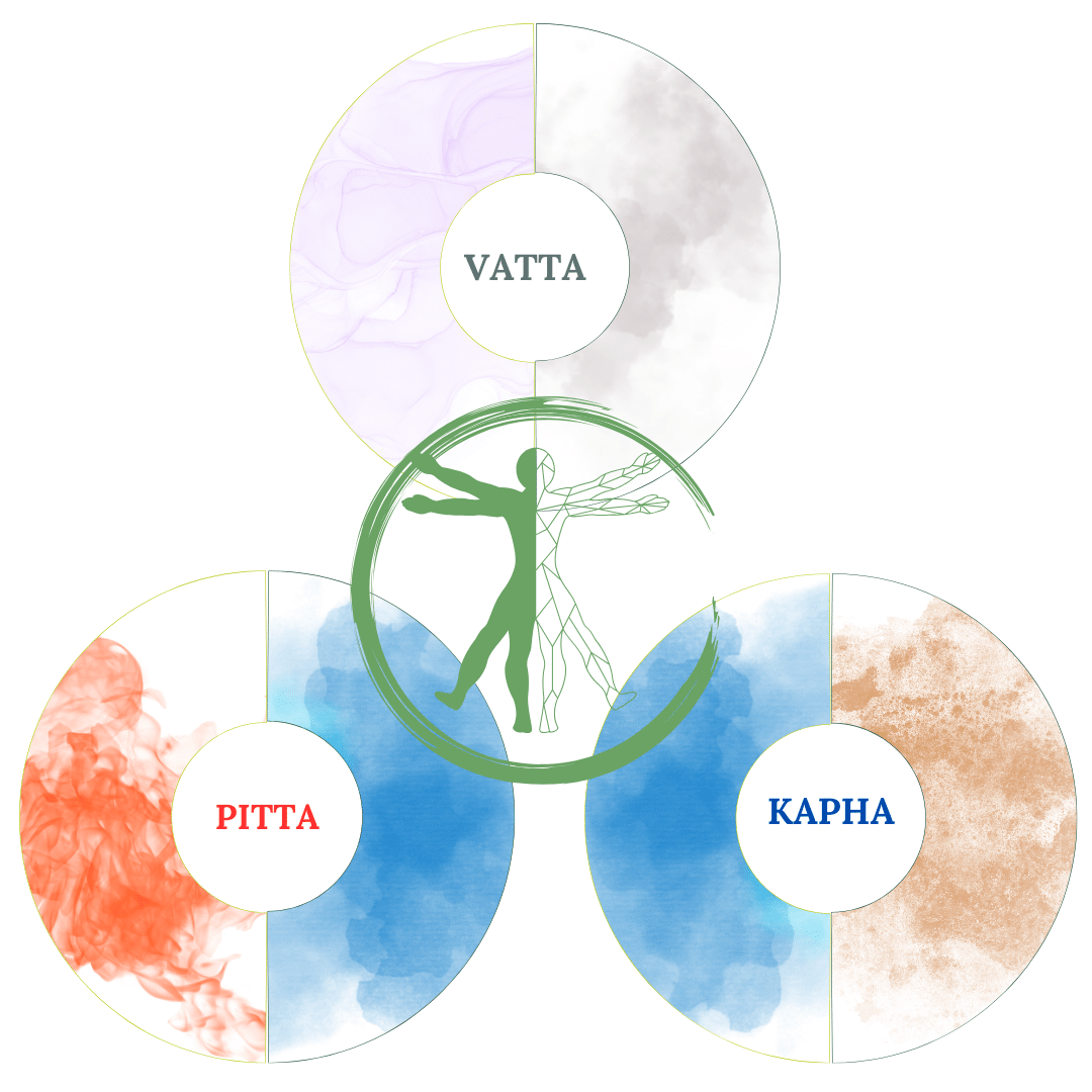 Energie łączą się w pary tworząc tzw. DOSZE: VATA -PITTA-KAPHA, zarządzające innymi tkankami ciała, narządami, funkcjami, warunkujące nasz wygląd, reakcje, myślenie i odczuwanie: